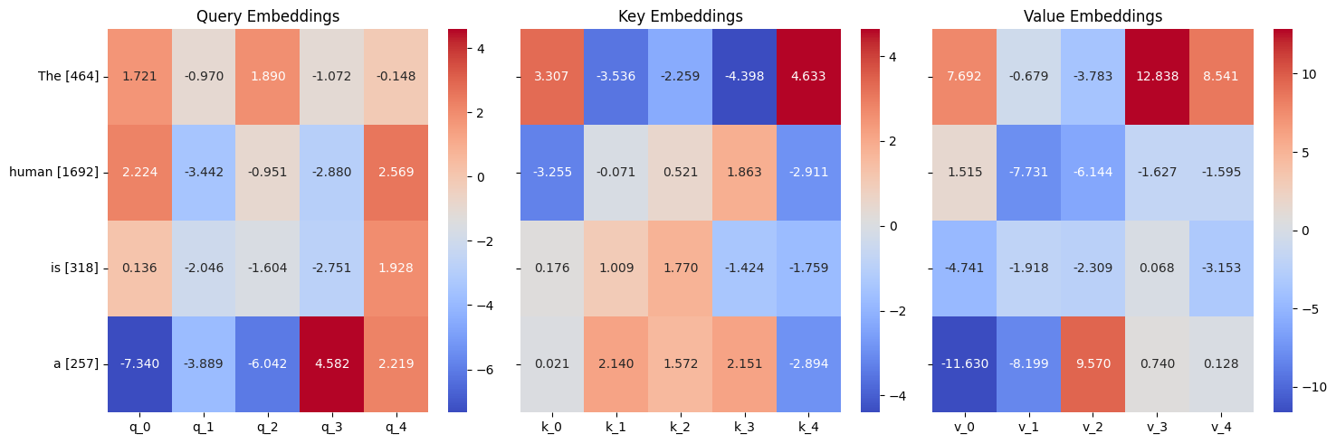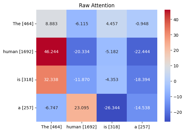 Let's pay attention to the query vector for "a" as it is this vector that will be used to attend to the other words in the sequence to predict the last word. We see that that the magnitude for each of its elements are large in comparison to other query vectors. Furthermore, if you compare the query vector for "a" to the key vectors, we can see that the signs and magnitudes line up well for the key vector for "human". This makes sense because the model needs to attend to "human" in order to predict "person". When the queries are matrix multiplied with the keys we get the following attention matrix.