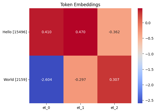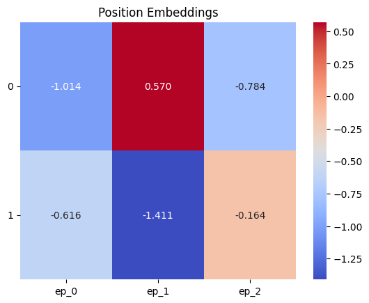 Now, we need to represent the position of each token in the sequence. For our simple example, we will create another learnable embedding of size 3.