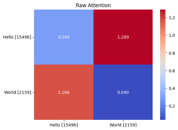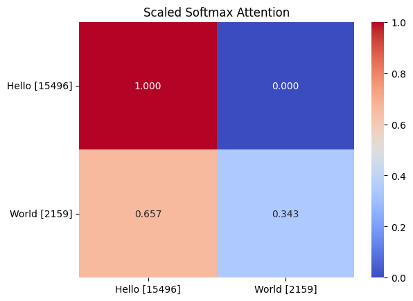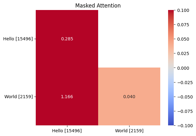 Finally, intuition takes hold here. Each cell represents with what probability the input word (y-axis) should attend to the target word (x-axis). We can see that the input word of "Hello" should attend to itself with a probability of 1.0. This is because it is the first word in the sequence and therefor cannot attend to any other word. However, given our randomly initialized parameters, we can see that "World" should attend to the values of "Hello" slightly more than itself.
