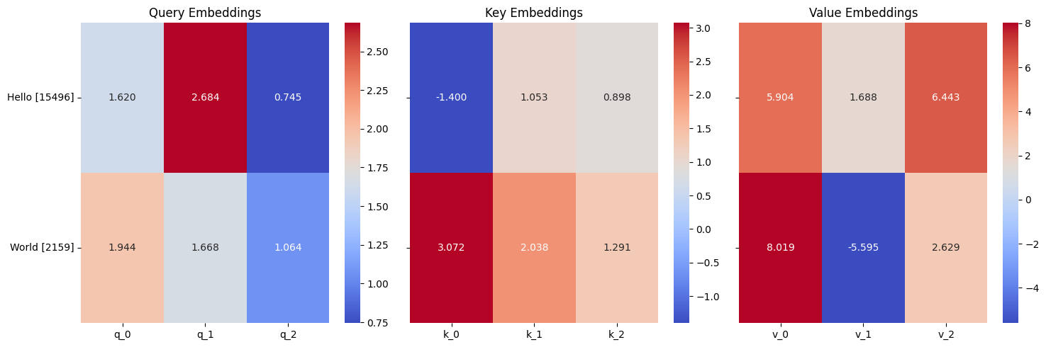Now we can get to meat of the attention mechanism. We will use 3 simple linear layers to create the queries, keys, and values. These are learnable parameters that can be trained eventually. Roughly speaking, the queries represent the word that we are inquiring about, the keys represent the other words in the sequence, and the values represent information that we would like to pass forward in our network regarding each word in the sequence. Let's create our query, key, and values.