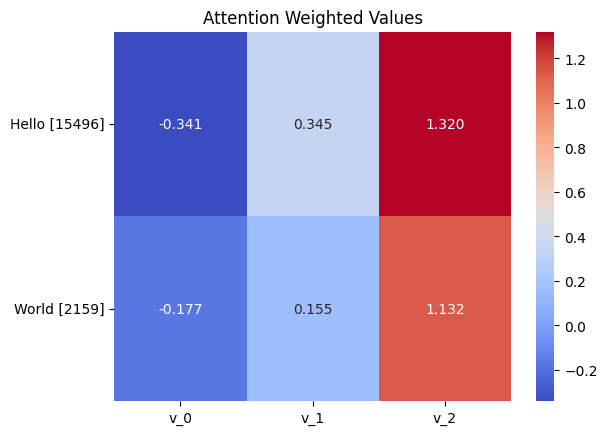 Now that we have the probabilities/attention weights, we can scale our values proportionally by the weights. The values are also learnable parameters that will be trained and will contain vital information that allows the model to help predict the next word in the sequence.