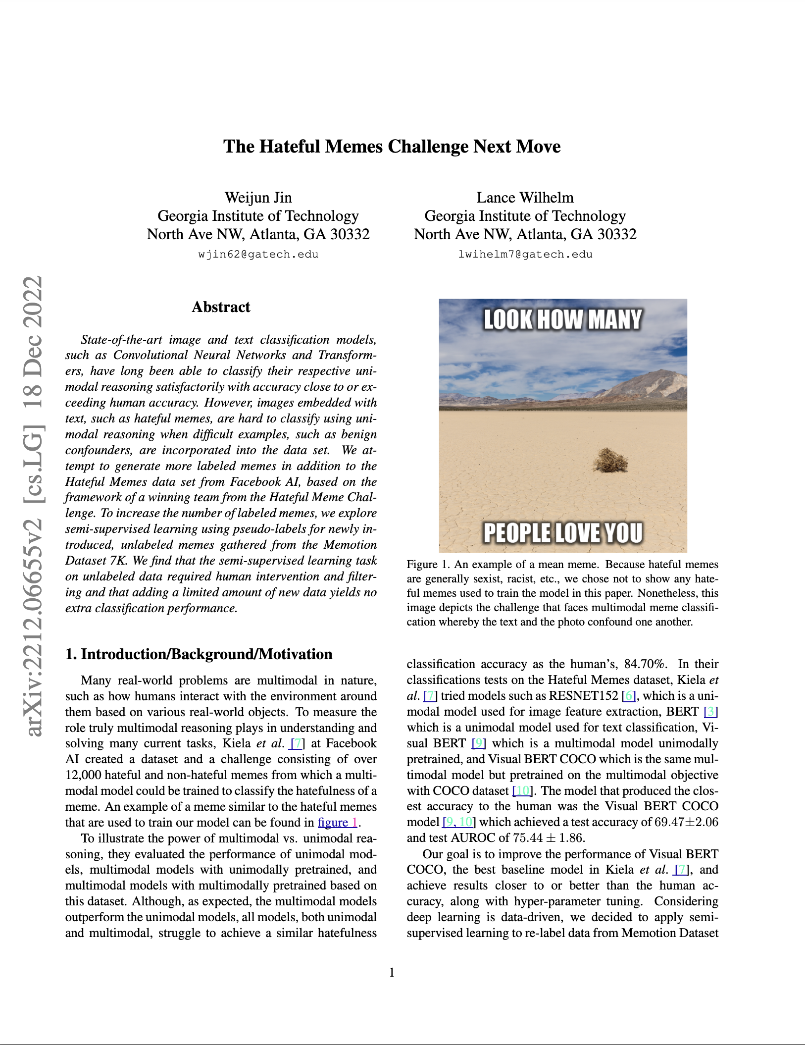 Our objective was to enhance the performance metrics of the baseline model, Visual Bert COCO, with the goal of achieving human-like accuracy (84.7%) in classifying hateful memes. We used the Memotion Dataset 7K and employed semi-supervised learning to enrich the original Facebook AI training data.