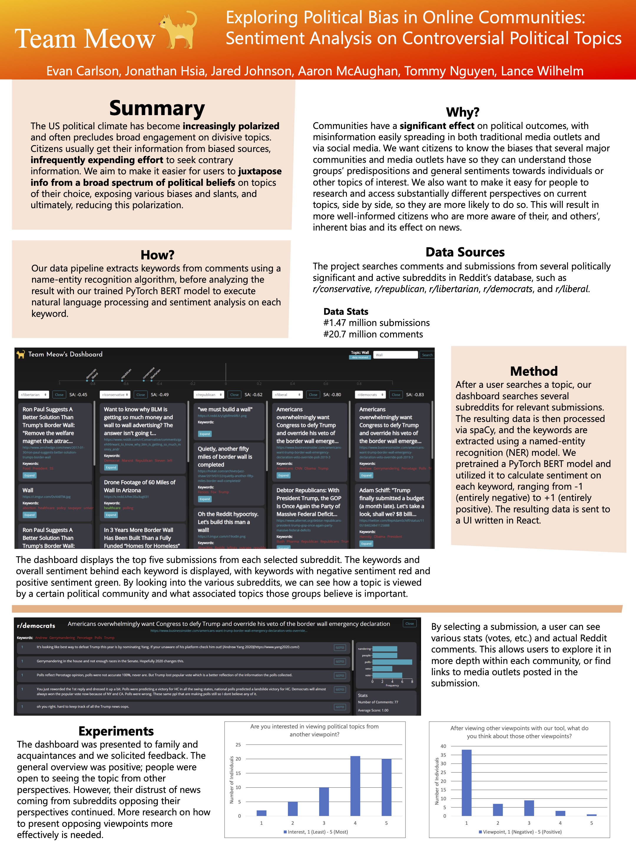 Provide dashboard to family members or acquaintances. Solicit subjective scores on UI design, how well UI reports each subreddit’s sentiment, and likelihood of the user to explore opposing ideologies. Anecdotally, family and friends overwhelmingly approved of the concept. In usage, primary concerns expressed were (1) slowness, (2) method for accessing, (3) believability (especially regarding the 15% inaccuracy rate or occasional counterintuitive results such as r/Republican “disapproving” of a border wall), and (4) utility (in particular, making relevant news article links faster to locate). Around 70% of the 58 persons shown the dashboard thought they might like to use it more in the future. (Of course, our personal relationships with these individuals introduces a bias that is likely to inflate this rate.)